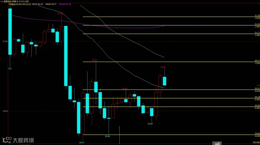 等待价格回踩30.06(1502)附近轻仓进场做多,以1小时K线实体收于29.66(1482)之下止损,短线目标看1534附近,到位上移止损到建仓成本价,看第二目标31.11~31.35(1554~1566)区域。