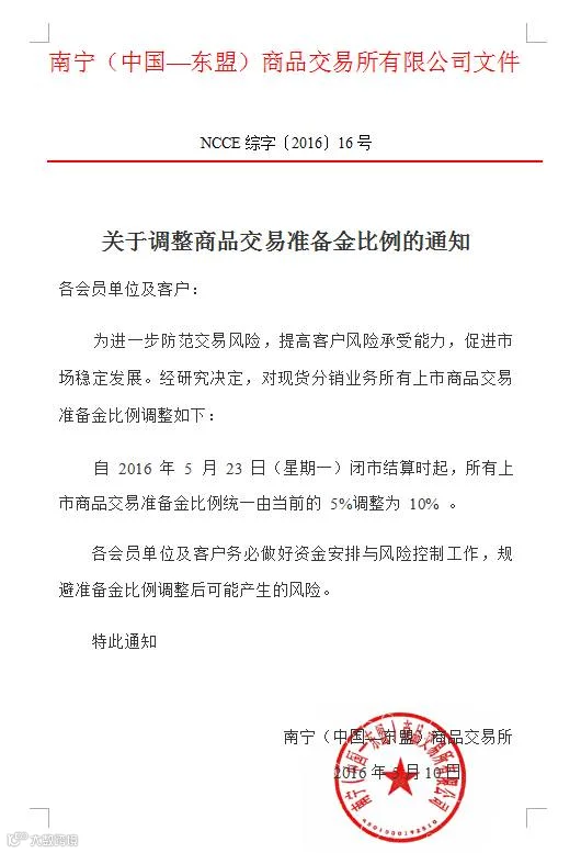 以下是南宁(中国——东盟)关于调整商品交易准备金比例的通知,自2016年5月23日(星期一)闭市结算时起,所有商品交易准备金比例统一由当前的5%调整为10%,请各位客户务必做好资金安排与风险控制工作,规避准备金比例调整后可能产生的风险。