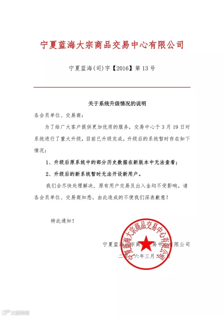 以下是宁夏蓝海平台关于系统升级情况的说明,请各位客户知悉。详情请点开大图。