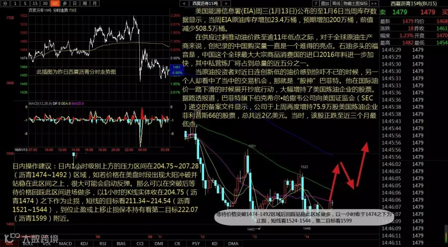 日内1小时级别上方的压力区间在204.75~207.28(沥青1474~1492)区域,如若价格在美盘时段出现大阳冲破并站稳在此区间之上,很大可能会启动反弹。那么可以在突破后等待价格回踩此区间进场做多,以1小时的K线实体收在204.75(沥青1474)之下作为止损,短线的目标看211.34~214.54(沥青1521~1544),到位止盈或上移止损保本持有看第二目标222.07(沥青1599)附近。