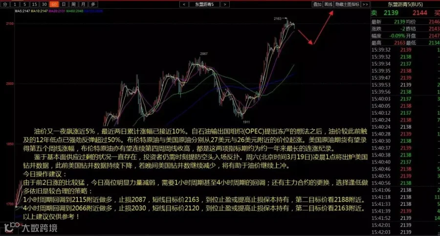 由于前2日涨的比较猛,今日高位明显力量减弱,需要1小时周期甚至4小时周期的回调;还有主力合约的更换,选择逢低做多依旧是较合理的策略: