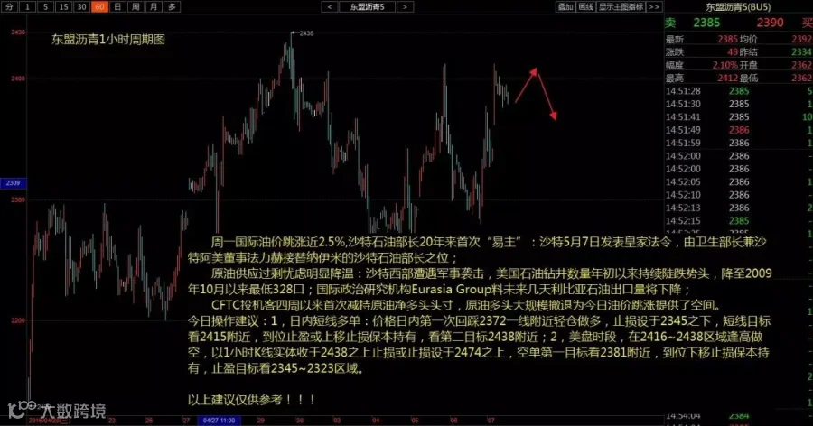 2、美盘时段,在2416~2438区域逢高做空,以1小时K线实体收于2438之上止损或止损设于2474之上,空单第一目标看2381附近,到位下移止损保本持有,止盈目标看2345~2323区域。