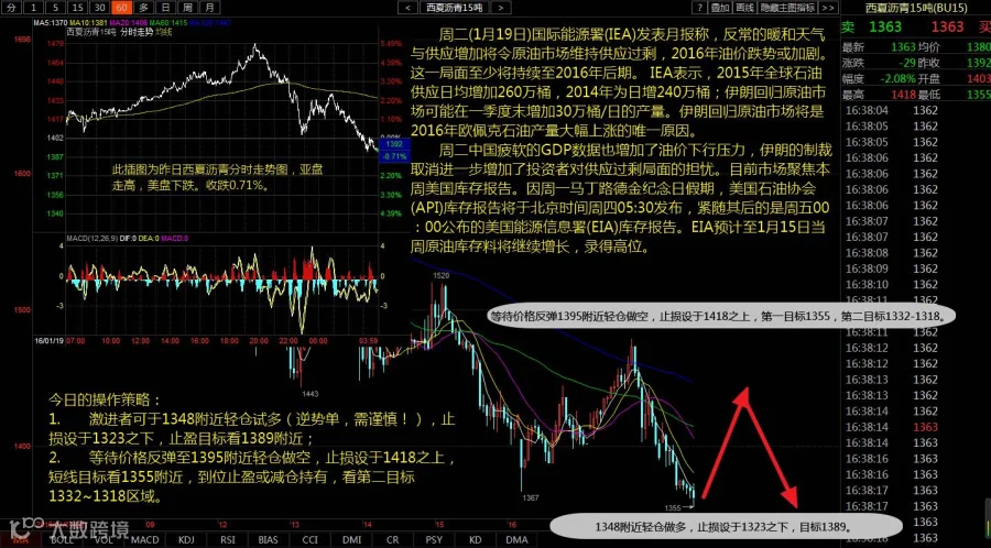 1. 激进者可于1348附近轻仓试多(逆势单,需谨慎!),止损设于1323之下,止盈目标看1389附近;