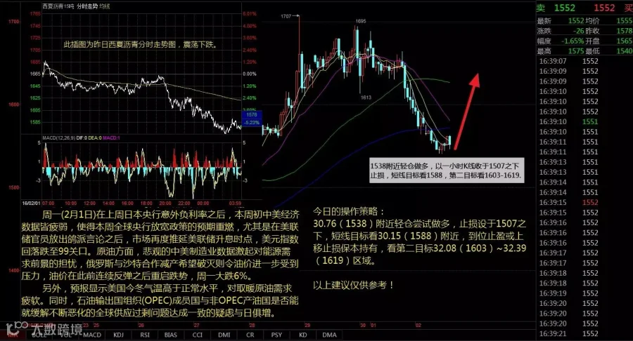 30.76(1538)附近轻仓尝试做多,止损设于1507之下,短线目标看30.15(1588)附近,到位止盈或上移止损保本持有,看第二目标32.08(1603)~32.39(1619)区域。