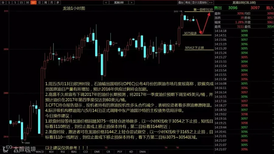 1.欧盘时段等待龙油价格回踏3075一线轻仓进场做多,以一小时K线收于3054之下止损,短线目标看3110附近,到位止盈或上移止损保本持有,第二目标看3144附近;