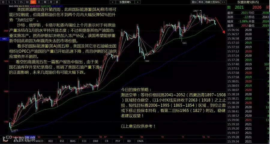 激进空单:等待价格回测2041~2052(西夏沥青1897~1908)区域轻仓做空,以1小时K线实体收于2063(1918)之上止损,短线目标看2006~1995(1865~1854)区域,到位止盈或下移止损保本持有,看第二目标1965(1827)附近。稳健者建议观望!