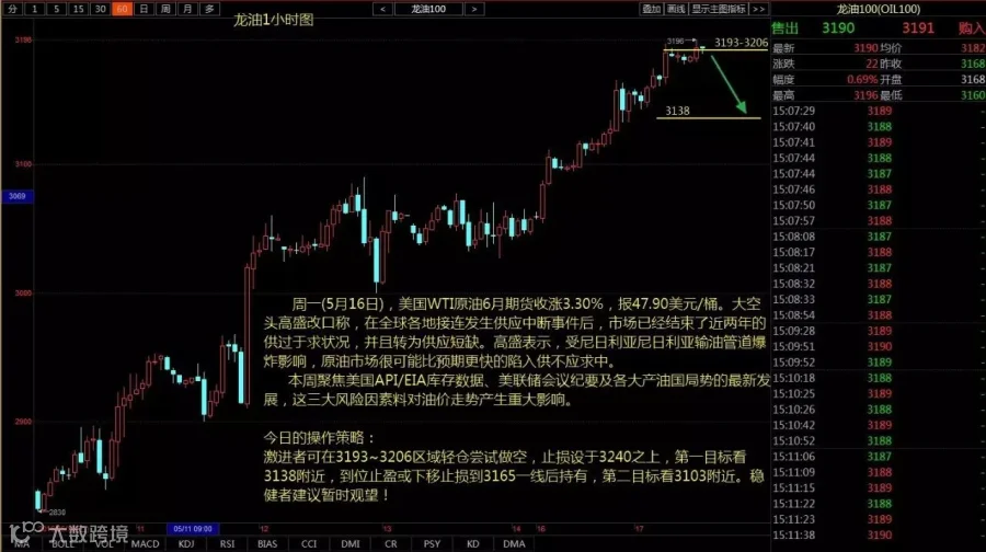 激进者可在3193~3206区域轻仓尝试做空,止损设于3240之上,第一目标看3138附近,到位止盈或下移止损到3165一线后持有,第二目标看3103附近。稳健者建议暂时观望!