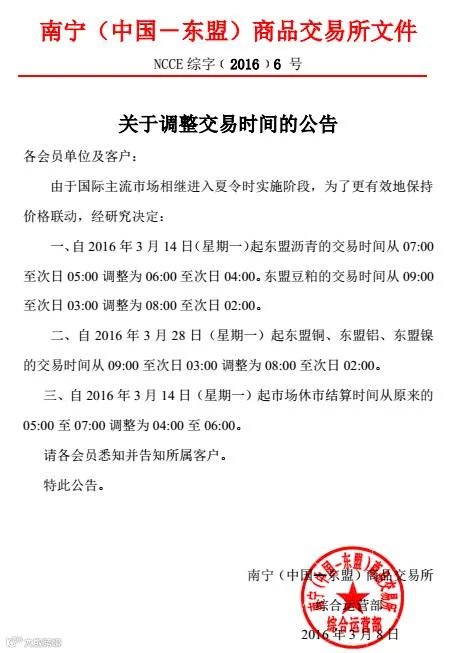 导读:关于东盟平台调整交易时间的通知,各产品交易时间均有所改变,请各位客户朋友知悉!详情请见下图。