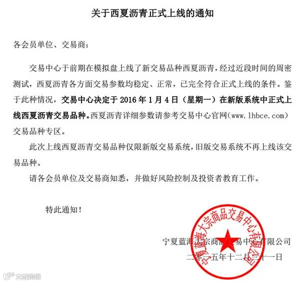 关于西夏沥青正式上线的通知
