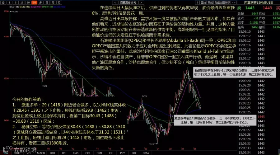 2.稳健空单:等待价格反弹至30.43(1488)~30.88(1510)区域轻仓逢高进场做空,以4小时K线实体收于31.32(1531)之上止损,短线止盈目标看29(1418)附近,到位减仓下移止损持有,看第二目标1390附近。