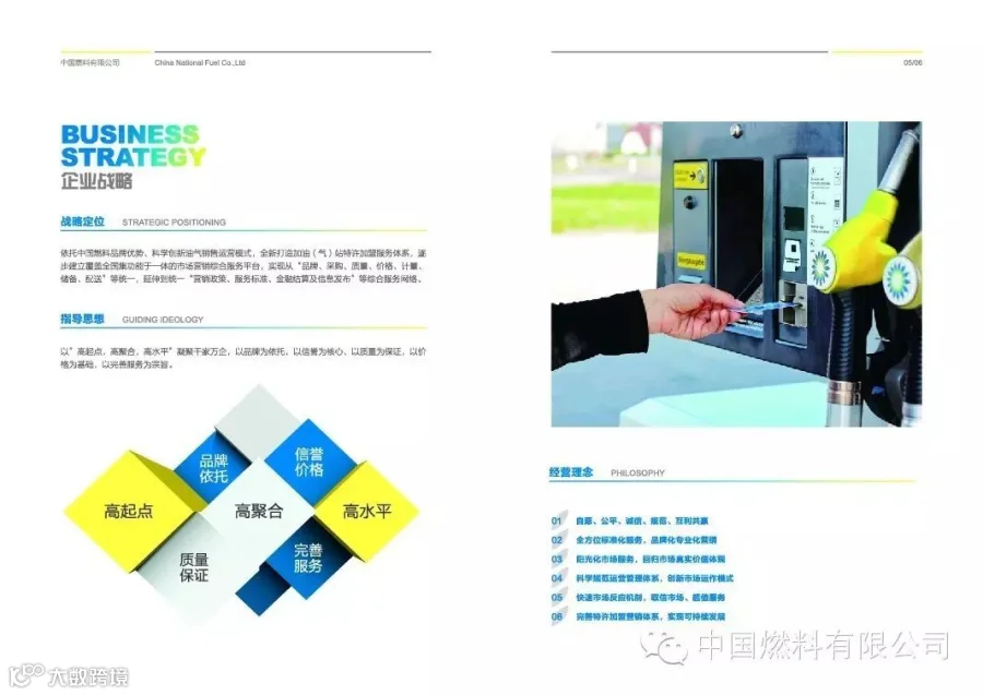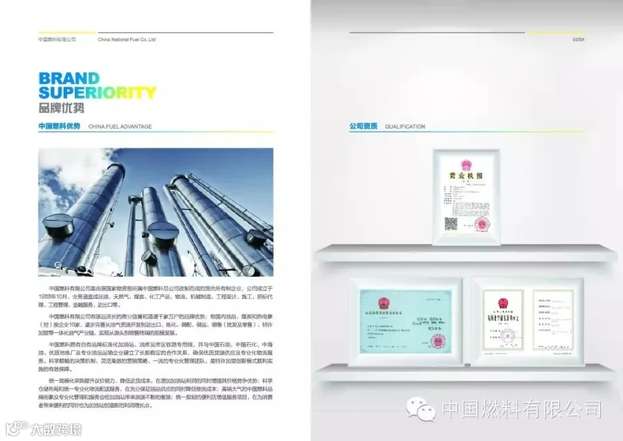 中国燃料有限公司有源远流长的商业信誉和温暖千家万户的品牌优势;有国内油品、煤炭和热电参(控)股企业16家,逐步完善从油气资源开发到进出口、炼化、调配、储运、销售(批发及零售)、特许加盟等一体化油气产业链,实现从源头到销售终端的规模发展。