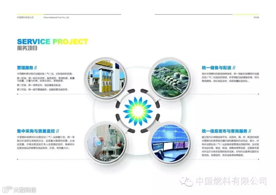 建立现代化网络信息平台,实现采、调、存、配送的流程化管理与财务系统无缝对接和数据的自动传送、统计,对特许加盟加油(气)站实施有效管理及风险控制;及时发布油品价格、物流、配送、销售政策等信息,定期发布国内外及行业有关政策和相关信息;对特许加盟单位提供业务咨询、政策指导、有关信息查询等服务。