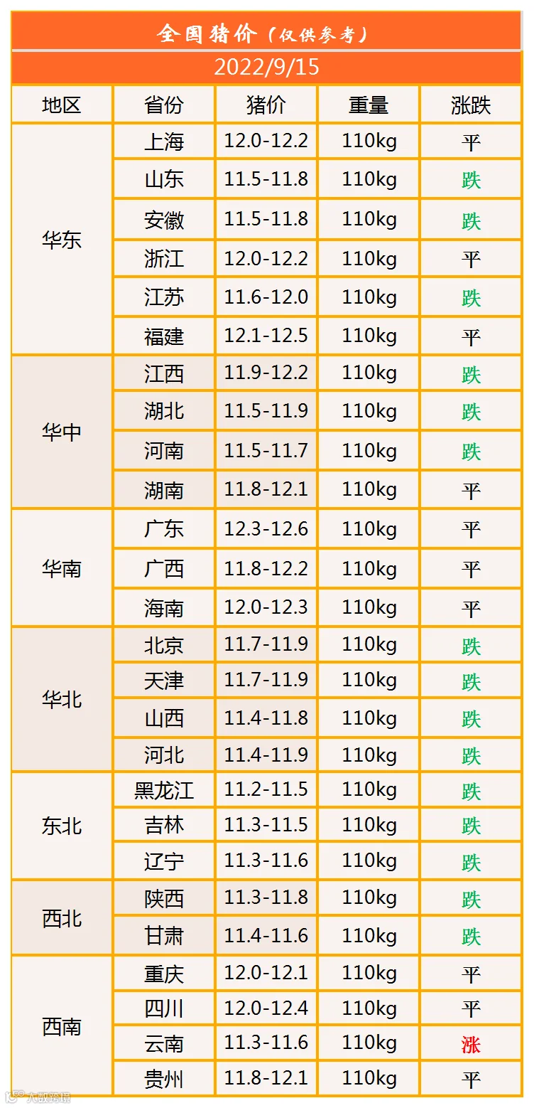 明日猪价2022年9月15日猪价信息