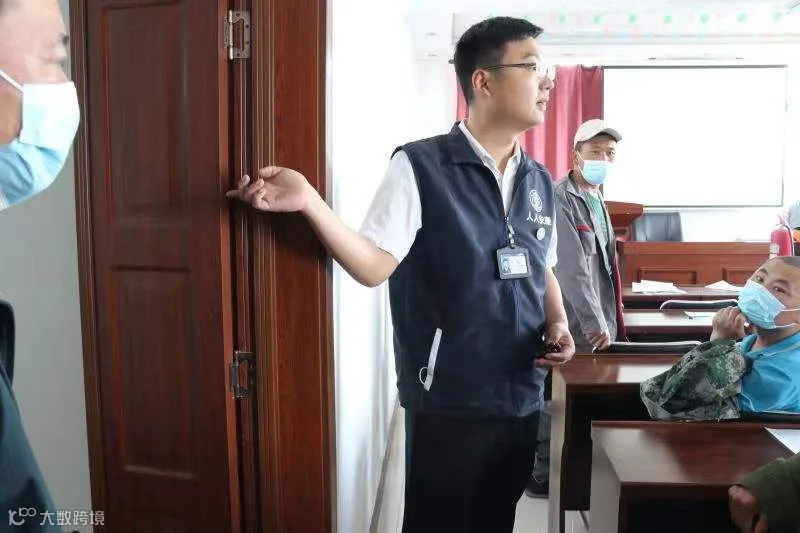 左侧佩戴安全帽人员正在及时疏导全员撤离火场