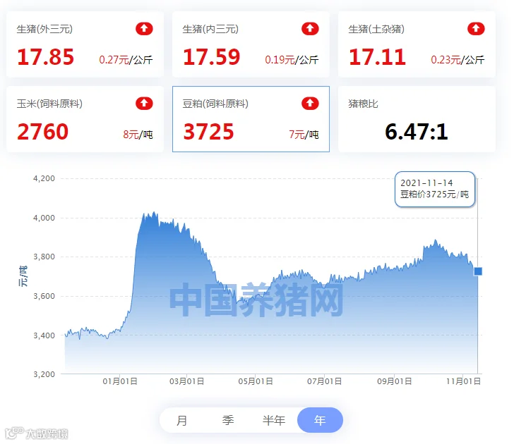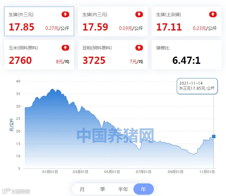 2021年11月14日(星期日),中国养猪网“养猪数据中心”监测的生猪价格以及饲料原料价格明细如下: