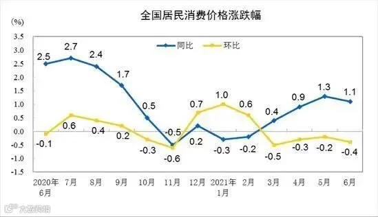 导读:据统计局网站消息 2021年6月份,全国居民消费价格同比上涨1.1%。其中,城市上涨1.2%,农村上涨0.7