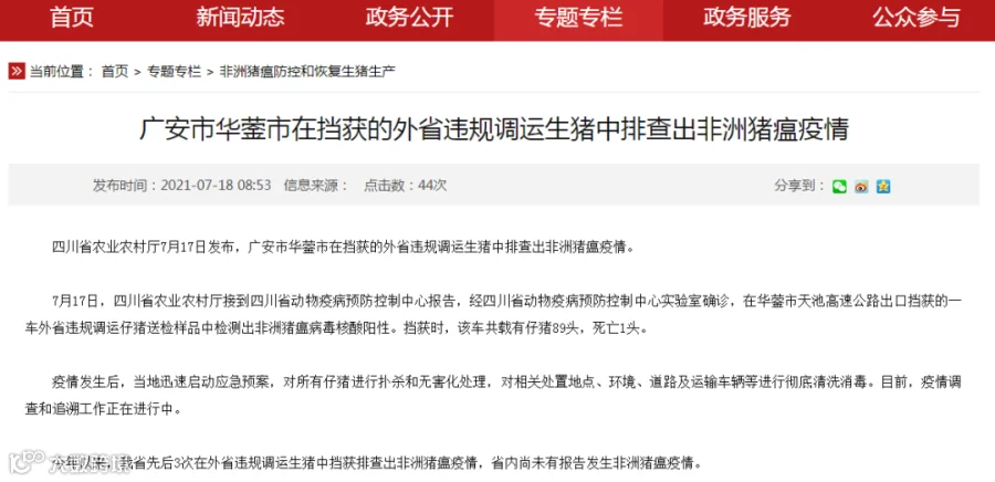 7月17日,四川省农业农村厅发布消息称,广安市华蓥市在挡获的外省违规调运生猪中排查出非洲猪瘟疫情。疫情发生后,当地已对车上89头仔猪进行扑杀和无害化处理。