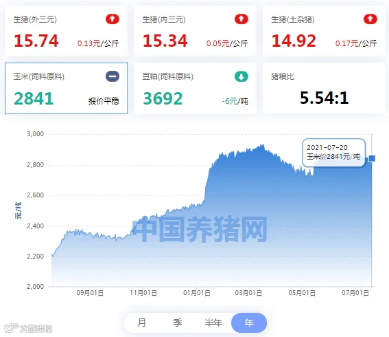 今日玉米(饲料原料)均价2841元/吨,今日饲料原料价格与昨日持平。