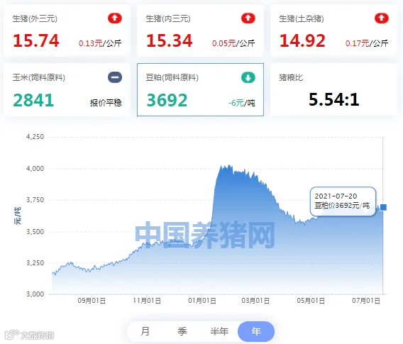 今日豆粕(饲料原料)均价3692元/吨,今日饲料原料价格价格较昨日下跌了6元/吨。