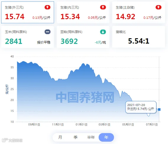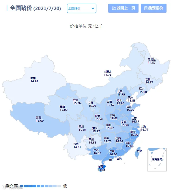 2021年07月20日(星期二),中国养猪网猪价系统平台监测的生猪价格以及饲料原料价格明细如下: