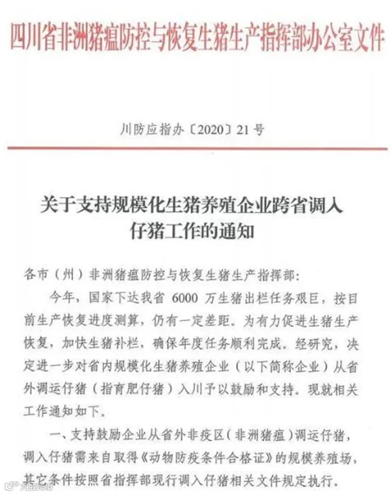 2018年11月四川全面禁止了生猪跨省调运之后,直到2020年4月24日,四川省非洲猪瘟防控与恢复生猪生产指挥部办公室下发《关于支持规模化生猪养殖企业跨省调入仔猪工作的通知》(以下简称《通知》),决定进一步对省内规模化生猪养殖企业从省外调运仔猪(指育肥仔猪)入川予以鼓励和支持,禁令开始有条件解封。