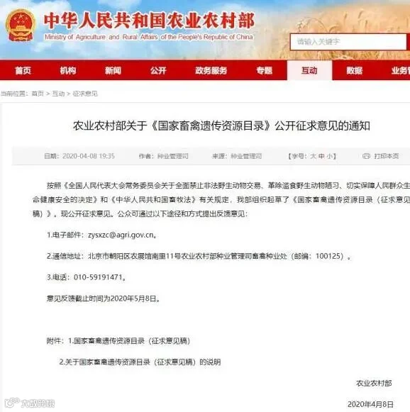 4月8日,农业农村部在其官网公布了《国家畜禽遗传资源目录(征求意见稿)》(简称《目录》)并向社会公开征求意见,《目录》包括家养的传统畜禽和特种畜禽共31个种,列入《目录》的动物,着按照家畜家禽进行管理,可以用于食用等商业利用。