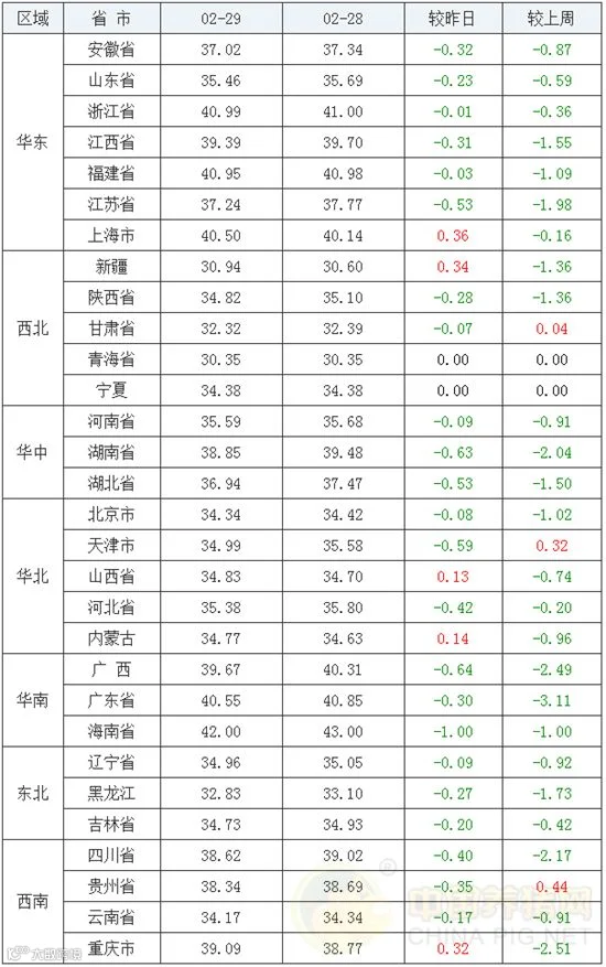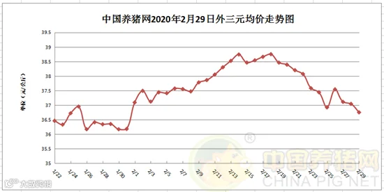 2020年2月29日,据中国养猪网猪价系统监测,全国外三元均价为36.75元/公斤,猪价较昨日下跌0.29元/公斤,较上周下跌1.32元/公斤。涨幅在0.13-0.36元/公斤,跌幅在0.01-1.00元/斤之间。
