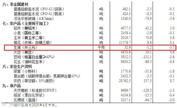 国家统计局据对24个省(区、市)流通领域9大类50种重要生产资料市场价格的监测显示,2020年4月下旬与4月中旬相比,10种产品价格上涨,36种下降,4种持平。其中生猪(外三元)价格为32.9元/千克,环比下降3.5%。