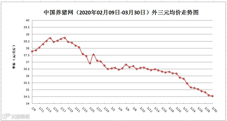 从“2020年03月30日-中国养猪网生猪(外三元)均价走势图”来看,猪价先从36.50元/公斤跌到了35.00元/公斤,再从35.00元跌到了34.50元/公斤,现在离34.00元/公斤也很接近了。全国生猪价格呈现跌涨调整态势,涨得少,跌得多。猪价整体下跌现象没有放缓,下跌现象主要集中高价区,低价区有企稳态势,部分屠宰企业低价猪源采购有着一定的难度。
