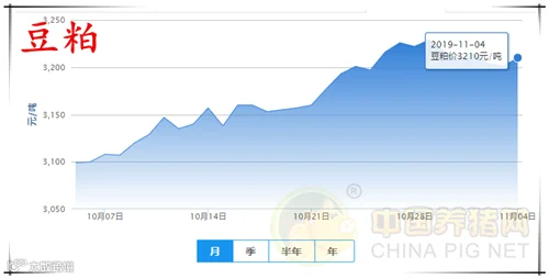 今日全国豆粕均价为3210元/吨,较昨日上涨9元/吨,较上周下跌12元/吨;