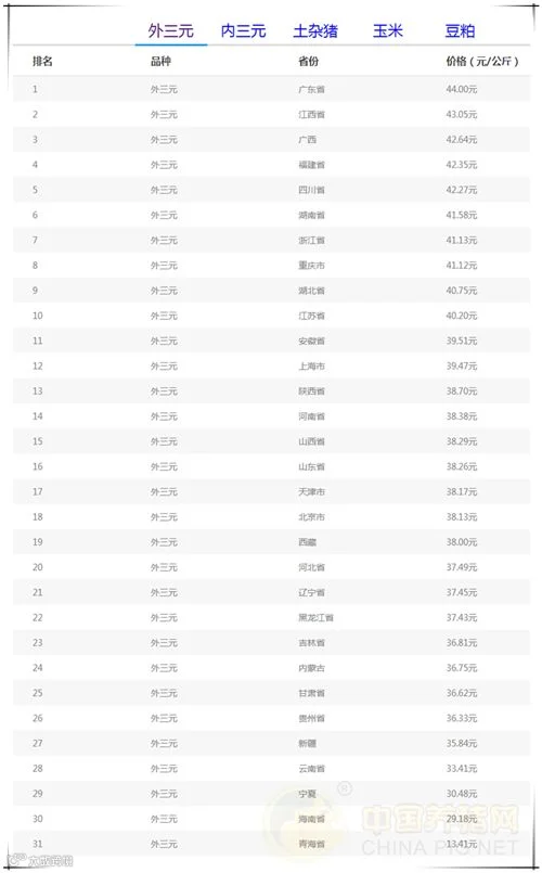 今日最高省份:广东省外三元均价为44.00元/公斤;