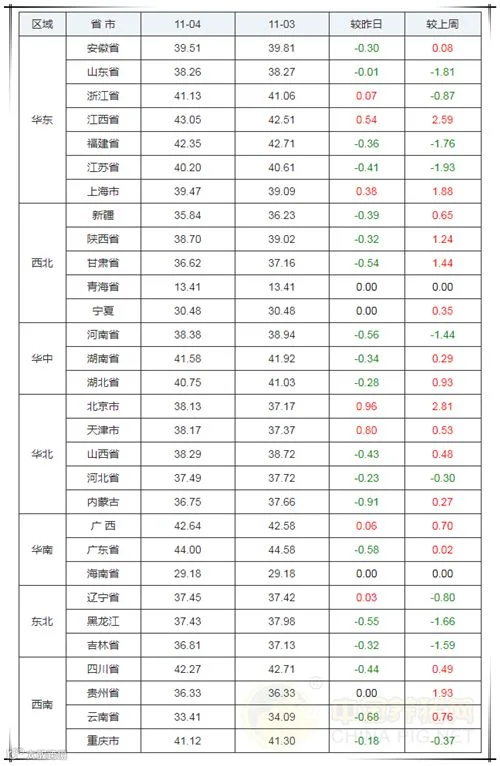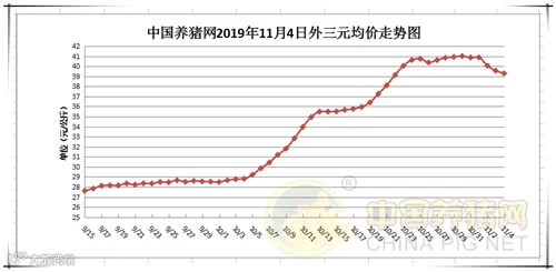 2019年11月4日,据中国养猪网监测全国生猪均价为39.29元/公斤,价格较昨日报价上涨0.27元/公斤,较上周上涨1.55元/公斤。今日猪价涨幅维持在0.03-0.96元/公斤,今日猪价跌幅维持在0.01-0.91元/公斤。