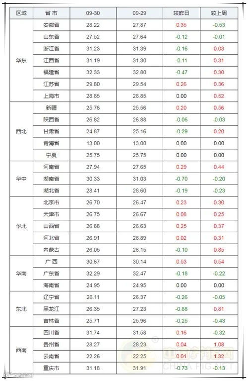 据中国养猪网数据监测显示,今日安徽地区生猪价格较昨日上涨0.35元/公斤,生猪均价28.22元/公斤;陕西地区生猪价格较昨日下跌0.06元/公斤,生猪均价26.82元/公斤;湖北地区生猪价格较昨日下跌0.19元/公斤,生猪均价28.41元/公斤,消费端对高价肉略有抵触心理,高价猪源消化能力一般;湖南地区生猪价格较昨日下跌0.70元/公斤,生猪均价30.33元/公斤,节假日提振作用有限,屠企开工率较低,外加北方低价猪源调入供需僵持不断,近期猪价还或以稳中下跌为主;天津地区生猪价格较昨日上涨0.08元/公斤,生猪均价26.75元/公斤;猪源有限,下游消费较为疲软,短期内猪价或持续以稳为主;广东地区生猪价格较昨日下跌0.18元/公斤,生猪均价32.29元/公斤;四川地区生猪价格较昨日上涨0.16元/公斤,生猪均价31.74元/公斤;吉林地区生猪价格较昨日下跌0.25元/公斤,生猪均价25.71元/公斤,国庆节提振效果有限,白条走货一般,预计近期猪价或以稳为主。