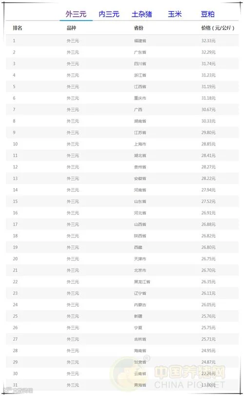 今日最高省份:福建省外三元均价为32.33元/公斤;