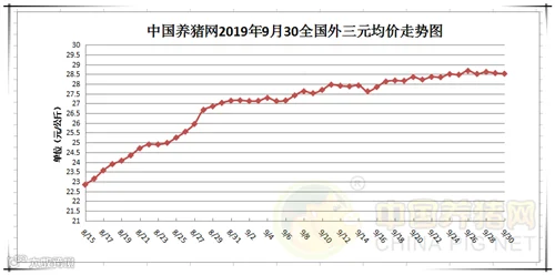 2019年9月30日,据中国养猪网猪价系统监测全国外三元均价为28.52元/公斤,价格较昨日下跌0.03元/公斤,较上周上涨0.18元/公斤。今日猪价涨幅维持在0.01-0.53元/公斤,今日猪价跌幅维持在0.06元/公斤-0.88元/公斤。
