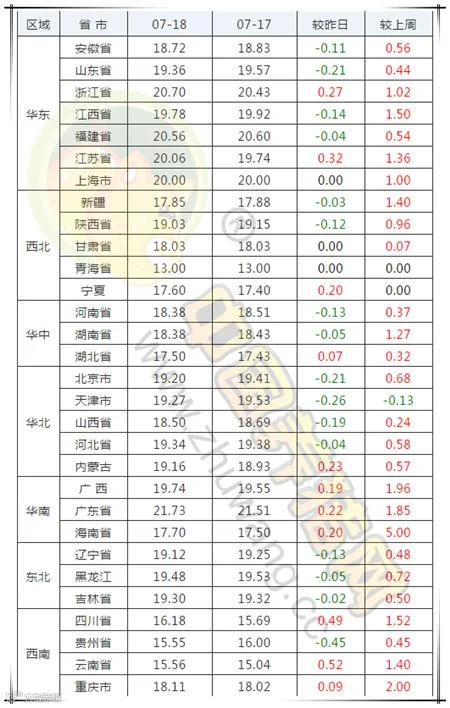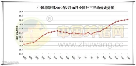 2019年7月18日,据中国养猪网猪价系统监测全国外三元均价为18.99元/公斤,价格较昨日上涨0.08元/公斤,较上周上涨1.01元/公斤。今日猪价涨幅维持在0.07-0.52元/公斤,跌幅维持在0.02-0.45元/公斤。
