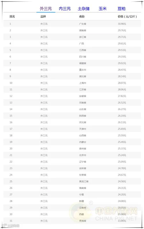 今日最高省份:广东省外三元均价为30.98元/公斤;