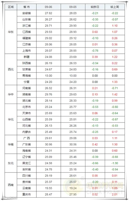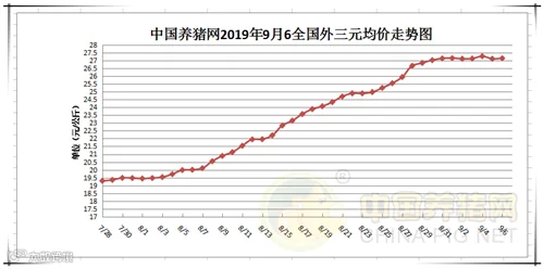 2019年9月6日,据中国养猪网猪价系统监测全国外三元均价为27.15元/公斤,价格较昨日上涨0.03元/公斤,较上周上涨0.12元/公斤。今日猪价涨幅维持在0.01-0.60元/公斤,今日猪价跌幅维持在0.10元/公斤-0.78元/公斤。