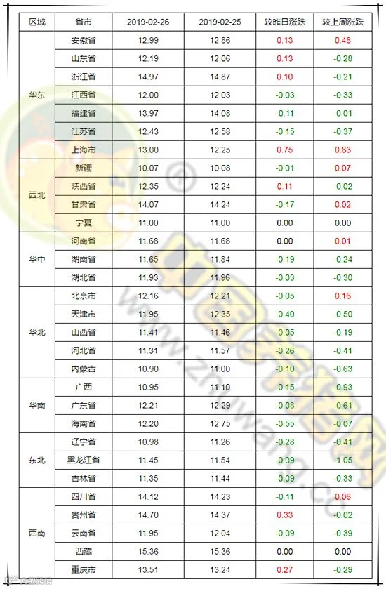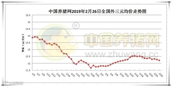 2019年2月27日,据中国养猪网猪价系统监测全国外三元均价为12.22元/公斤,较昨日下跌0.07元/公斤,较上周下跌0.26元/公斤。今日猪价涨幅维持在0.10-0.75元/公斤,跌幅维持在0.01-0.55元/公斤。