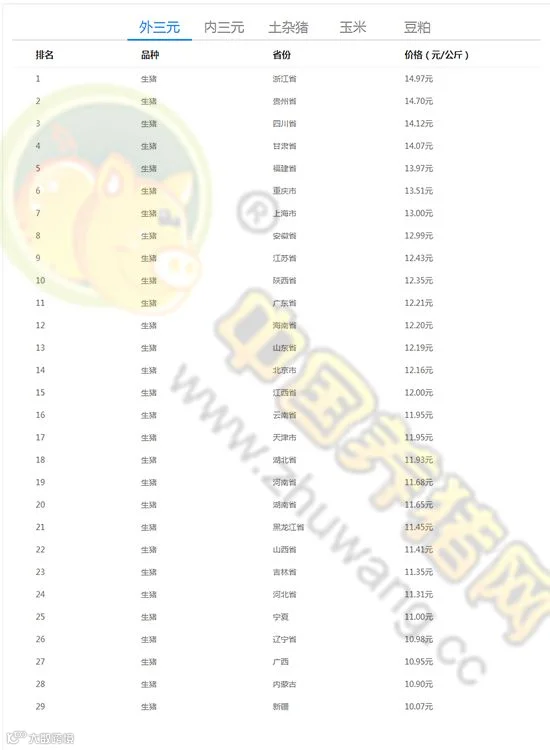 今日最高猪价:浙江生猪外三元均价为14.97元/公斤。今日最低猪价:新疆外三元均价为10.07元/公斤。