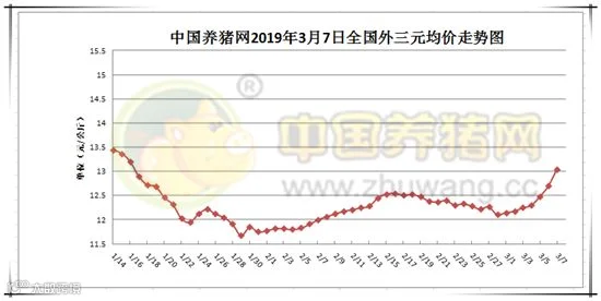 2019年3月8日,据中国养猪网猪价系统监测全国外三元均价为13.04元/公斤,较昨日上涨0.34元/公斤,较上周上涨0.93元/公斤。今日猪价涨幅维持在0.03-1.05元/公斤,跌幅维持在0.03-0.60元/公斤。