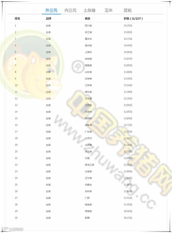 今日最高猪价:浙江生猪外三元均价为15.00元/公斤。今日最低猪价:新疆外三元均价为10.23元/公斤。
