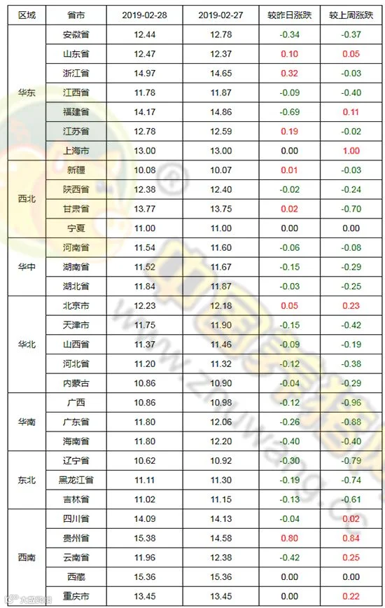 2019年3月1日,据中国养猪网猪价系统监测全国外三元均价为12.11元/公斤,较昨日0.16元/公斤,较上周下跌0.26元/公斤。今日猪价涨幅维持在0.10-0.80元/公斤,跌幅维持在0.02-0.69元/公斤。