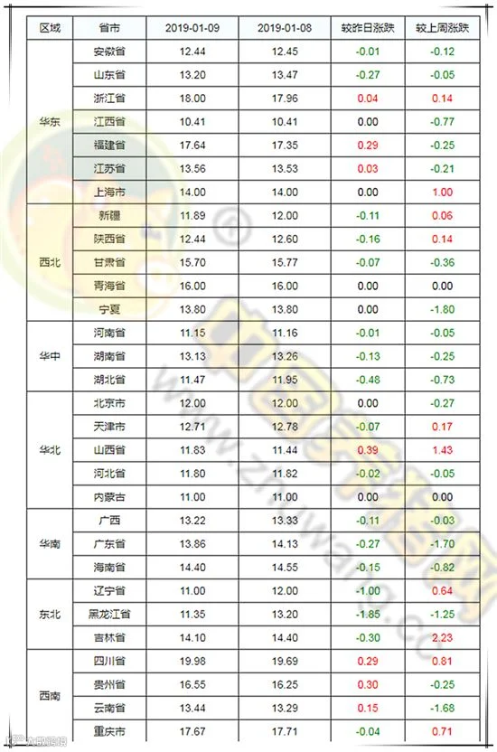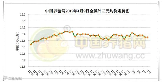 2019年1月9日,据中国养猪网猪价系统监测全国外三元均价为13.76元/公斤,较昨日上涨0.03元/公斤,较上周下跌0.08元/公斤,涨幅维持在0.03-0.39元/公斤,跌幅维持在0.01-1.85元/公斤。