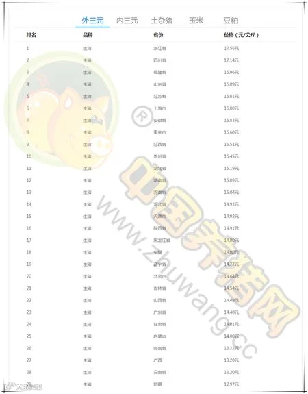 今日最高猪价:浙江省外三元均价为17.56元/公斤。今日最低猪价:新疆维吾尔自治区外三元均价为12.97元/公斤。