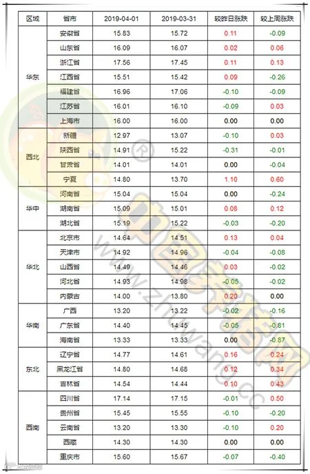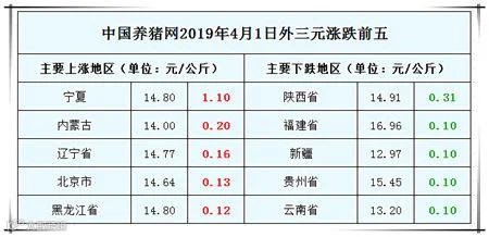 2019年4月2日,据中国养猪网猪价系统监测全国外三元均价为15.16元/公斤,较昨日下跌0.01元/公斤,较上周下跌0.05元/公斤。今日猪价涨幅维持在0.02-1.10元/公斤,跌幅维持在0.01-0.31元/公斤。