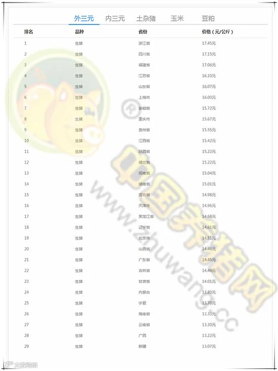 今日最高猪价:浙江省外三元均价为17.45元/公斤。今日最低猪价:新疆维吾尔自治区外三元均价为13.07元/公斤。