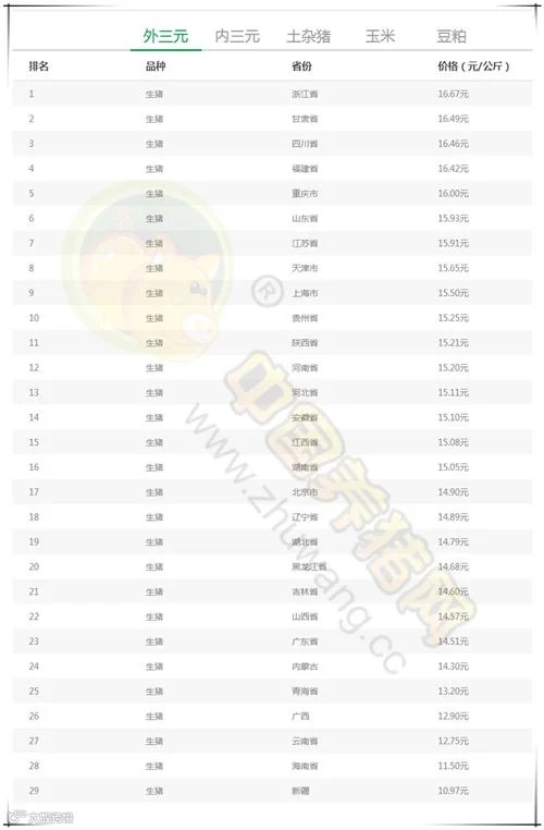 今日最高猪价:浙江省外三元均价为16.67元/公斤。今日最低猪价:新疆外三元均价为10.97元/公斤。