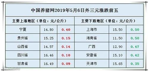 2019年5月6日,据中国养猪网猪价系统监测全国外三元均价为15.11元/公斤,较昨日下跌0.03元/公斤,较上周持平。今日猪价涨幅维持在0.02-0.40元/公斤,跌幅维持在0.02-0.50元/公斤。
