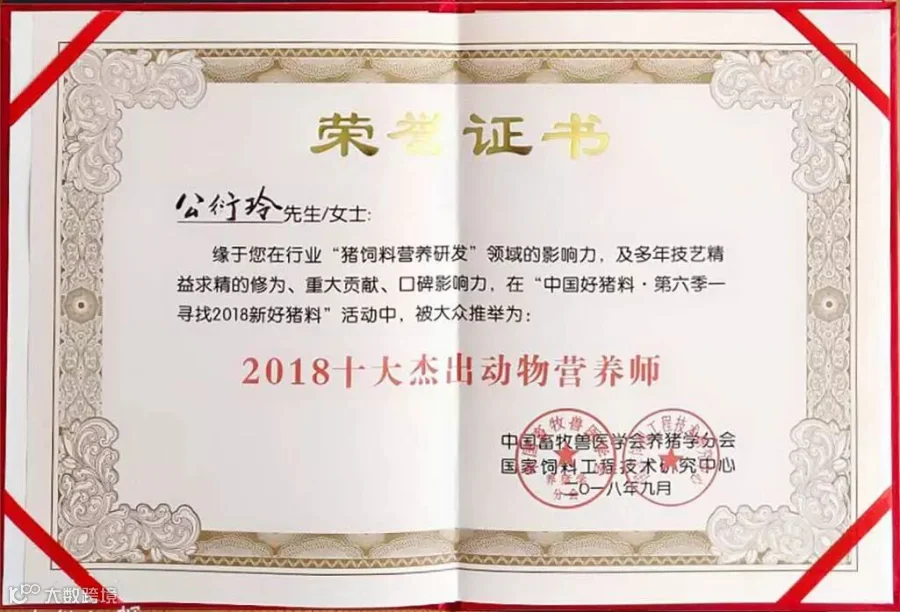 领鲜集团技术研发总监公衍玲博士以多年饲料营养研发沉淀、口碑影响力荣获“2018年十大杰出动物营养师”称号!“新时代、新要求、新技术!”公博士始终秉持“专业、准确、精准”的态度严格要求自己为新时代女性动物营养师树立了标杆!